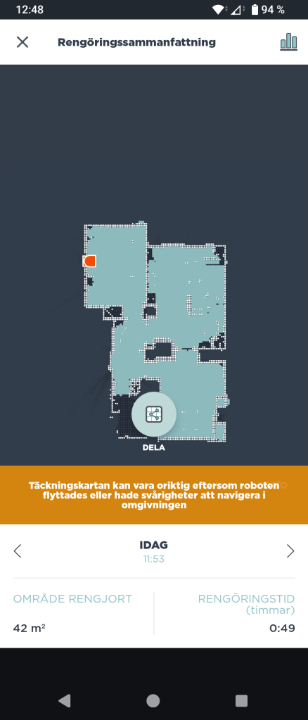 Med jämna mellanrum tjuter han ifrån och vill att vi ska rensa filtret. När han tycker att han är färdig så rullar han tillbaka till laddstationen och skickar ett nöjt meddelande via appen.